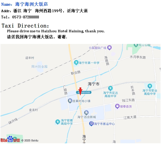 Haizhou Hotel Haining is located in the new commercial and cultural center of Haining City, adjacent to Haining Leather City, administrative center, sports center, cultural center, swimming pool, 5 minutes drive from the city center and passenger transport center, with superior geographical location and convenient transportation.